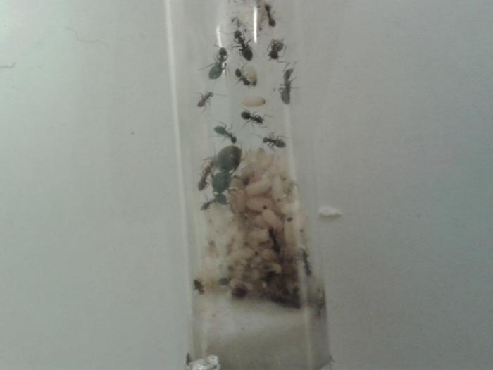 Видимо в новой пробирке ватку *прижал* к воде не достаточно глубоко, т.к. ее поверхность сухая (сбоку ватки отчетливо виден контур мокрой ватки, и 1мм сухой ваты). Мураши прорыли в ней *грот* и основную массу личинок хранят там.. как и Эмо