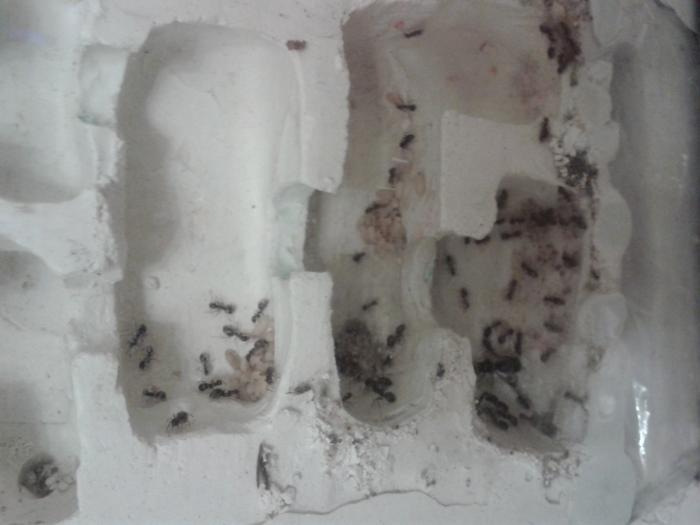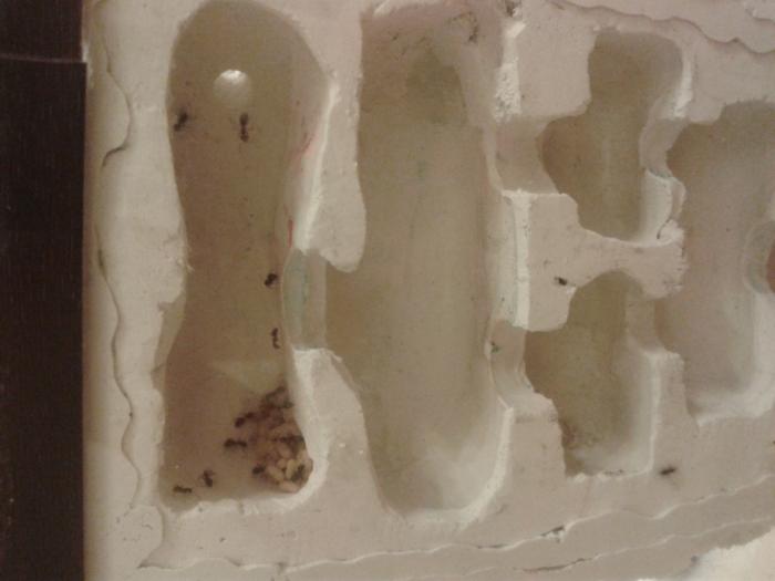 все верно.. видимо Ваши пратензис нашли выход в данной ситуации, была бы земля, они бы обсыпали личинок готовых к окукливанию крошками земли.. личинка плетет кокон цепляя шелковую нить за песчинки, комочки земли, внутри насыпанного на нее холмика, когда сплетет, рабочие муравьи очищают кокон, и он выглядит чистым и красивым.. если не будет такого материала которым бы муравьи могли обсыпать личинку, это вызывает как мне кажется среди нянек некий стресс, потому как в природных условиях эта ситуация немыслима для них, так как нехватки в земле, растительных останков -нет.. и они будут рыскать по форму и грызть гипс стараясь хоть чего нибудь нагрызть для того чтобы в дальнейшем этим обсыпать личинок.