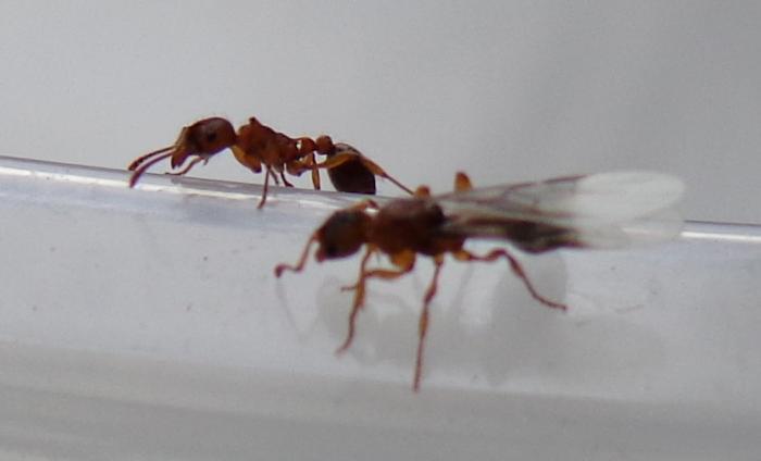 Размер больше нигера, но меньше красного муравья (фуски). Самец размером с рабочего, стройный.