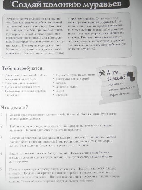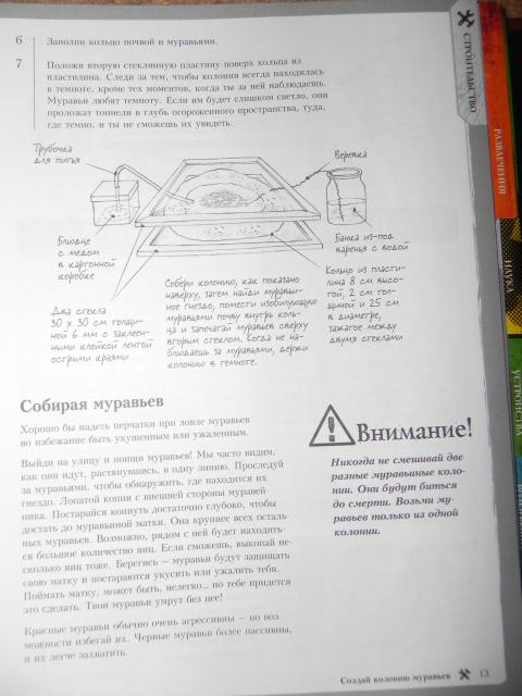 Так вот на одной из страниц этой книги была такая тема "Создай колонию муравьев". (Если честно, сделал в этой книге все, что только смог и на что хватило материалов. ) На страничке было написано что то подобное: Найди у себя во дворе муравейник и копни поглубже чтобы найти муравьиную матку, ведь она находится достаточно глубоко. Ну и я на позитиве побежал за лопатой и пошел искать муравейники. Сразу же за огородом я нашел флаусов(но этого я еще не знал тк, даже не представлял что КЛМ существует.) Да, к сожалению мне пришлось раскопать муравейник(простите меня) матку я так и не нашел. Немного поразмыслив я решил поискать немного в интернете. В вики была статья о "брачном лете", тут то я начитался и уже 26 июня/июля (не помню) В моей баночке бегало 5 маток нигретят) Тогда же я и зарегистрировался на КЛМ и положил начало своего первого