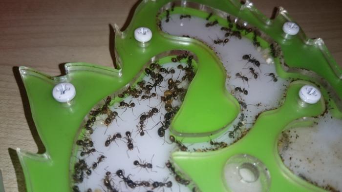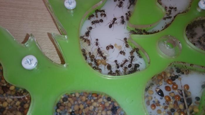 Они у меня никогда не ели личинок и куколок. Зачем их есть? Еды у них много. Муравьи едят только безжизненые яйца. Это доказано. Не зря они так копошатся в пакете яиц. Они разделяют кормовые яйца от нормальных яиц.