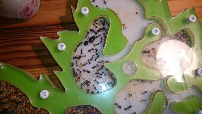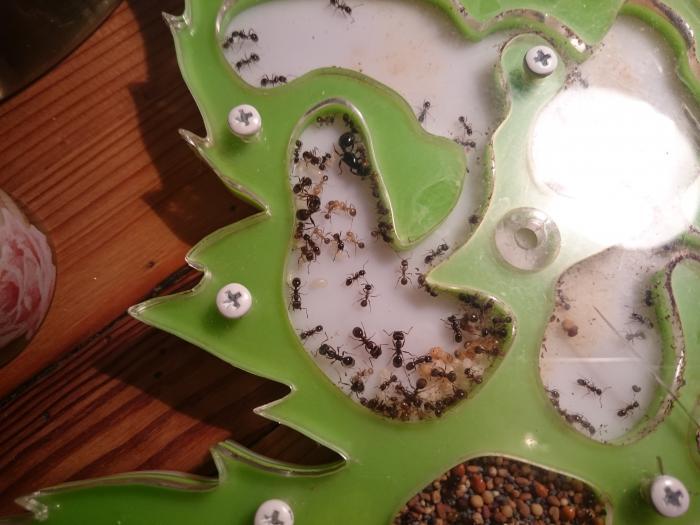 Сегодня решил написать, как проводит день моя матка Messor structor. Весь день она ходит между столовой и камерой матки. Каждый день откладывает яйца. Потом большинство отложенных яиц она съедает. Иногда спит. Фотографии ниже.