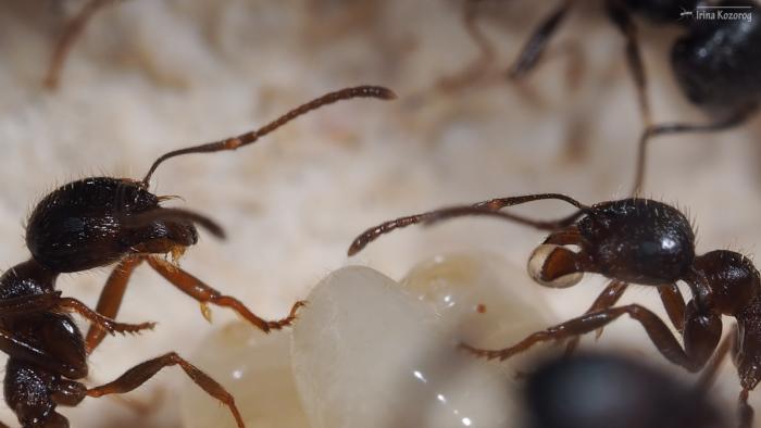 Даже таких малышей уже кормят яйцами, которые откладывают муравьи. Да-да, получается интересная ситуация. Все муравьи откладывают яйца, из некоторых яиц растят личинки, другие яйца идут на корм тем же личинкам!