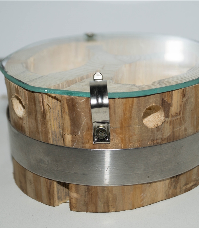 Металлическая полоса стягивает заготовку. Расщеп, что в древесине, шёл по всей длине 10 метрового ствола, от которого отпиливал.Стекло с одной стороны крепится винтом с прокладкой из куска силиконовой трубки. С другой стороны оно прижимается металлической пластиной. Если будет надобность открыть камеры, винты выкручивать не надо. Просто сдвинуть в бок и готово)