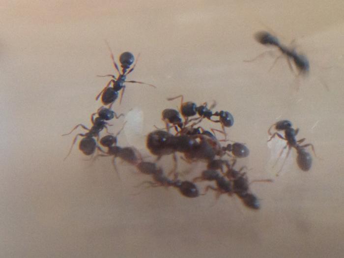 Уважаемые форумчане прошу помоч с определение вида мурашей. Нашел под камнем сразу черпанул заранее заготовленной баночкой от бахил. Сфотографировал на телефон через лупу с семикратным зумом. Размеры рабочих 2-3 мм Матки 3-4 мм.Я думаю это Tetramorium bicarinatum http://antclub.org/Myrmicinae/Tetramorium/Tetramorium_bicarinatum