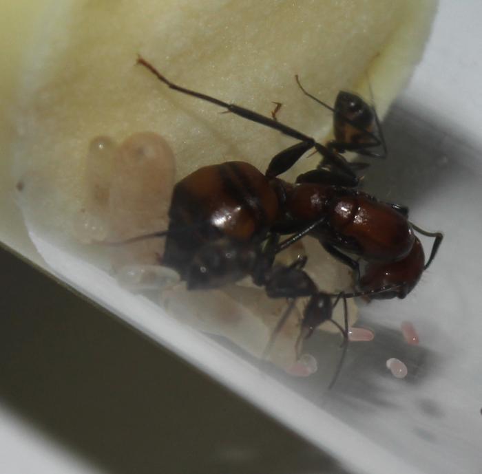 Вот еще пару фоток, и еда мурашков)) Но по вчерашнему наблюдению, кинул маленькова таракана нападала даже матка т.к 2 мураша это мало. И самое удивительно на фото ниже будут РОЗОВЫЕ яйца, что это???? и это нормально???