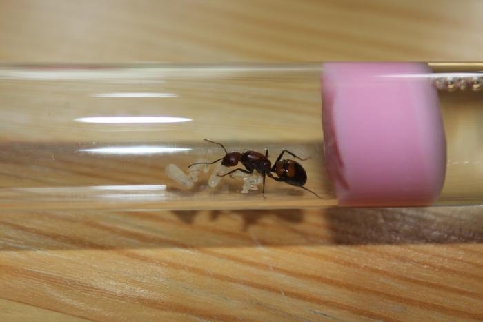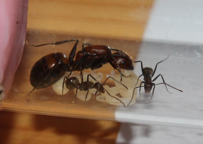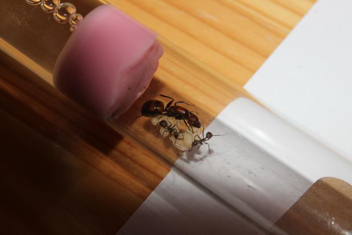 Пришла мурашка с расплодом из 3 маленьких личинок но спустя где то недели 2 появились эти два красавца. Щас положил им креветку, правда не знаю будут есть или нет т.к дрозофил нету у меня а мучника еще не поймал. Мураши еще совсем стеснительные и робкие так что позировать они мне отказались.