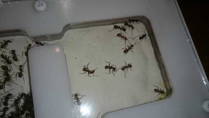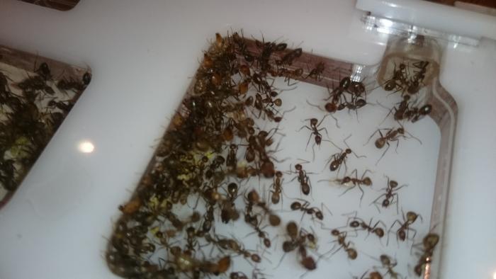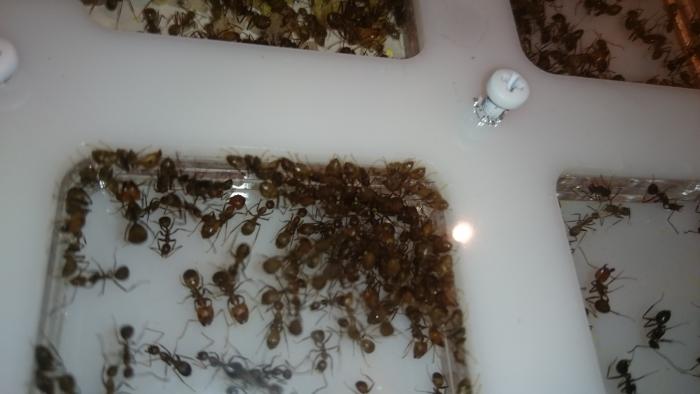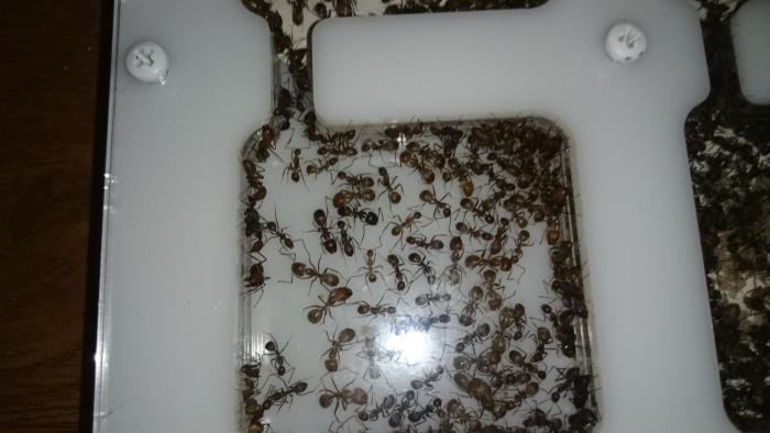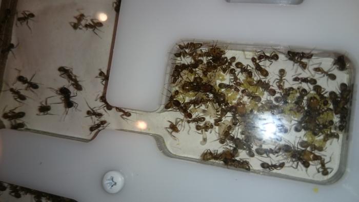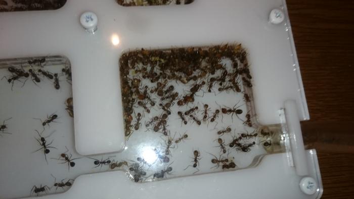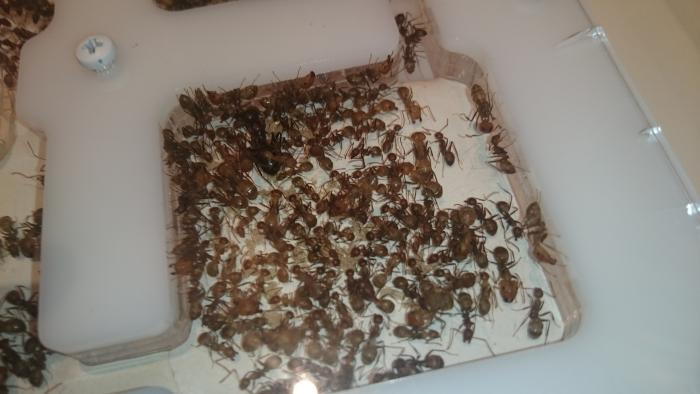 Здравствуйте, дорогие мирмикиперы! Моя колония сильно расплодилась. Много расплода и новорожденных. В одной камере они обустроили мусорку и туалет. На арене всегда много муравьев. Фотографии ниже.
