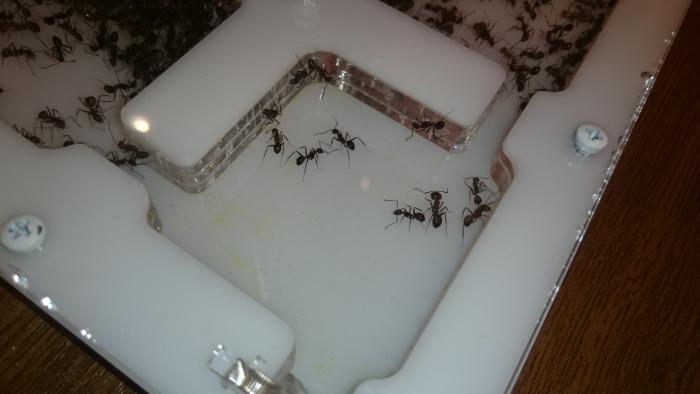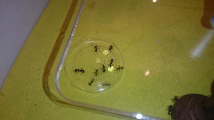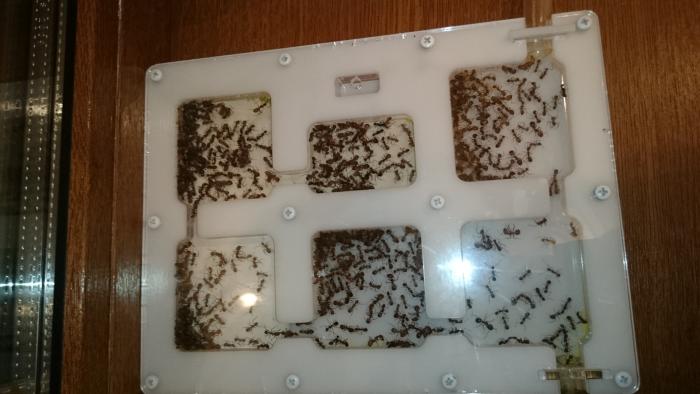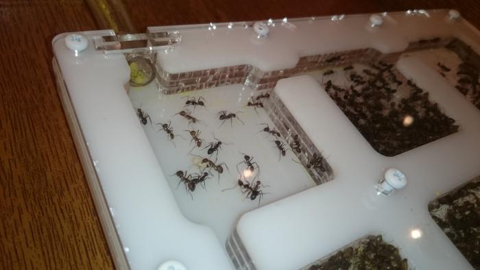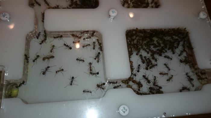 Что-то давненько я не писал про своих мурашей. Эта колония подросла и я подключил новый формикарий и арену. Очень много яиц. Много молодых солдат. Фотографии ниже. (на мусорку внимания не обращайте, муравьи на неё доступ не имеют).