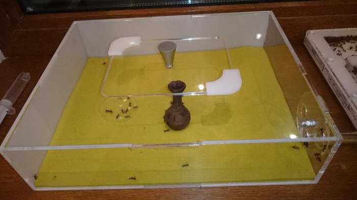 Недавно я получил семью муравьев Camponotus nicobarensis. Она была в большом формикарии. Некоторые камеры были закрыты ,потому что колония еще не доросла. Было несколько солдат. Кормлю белком и фруктами. На арену я насыпал песок. И поставил на арену для декора амфору. На арене есть поилка.