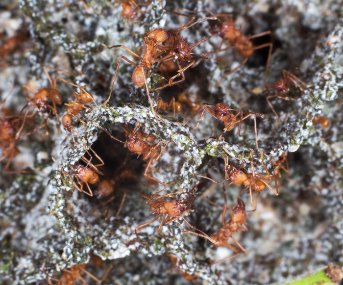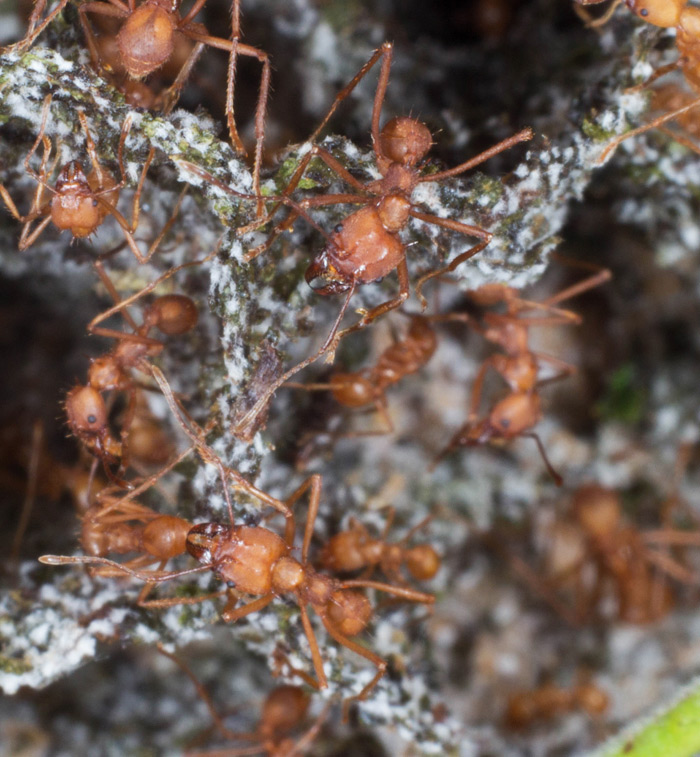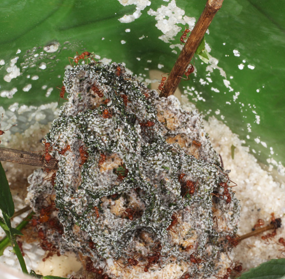 Еще одно фото того, из каких фрагментов состоят "молодые" стены муравейника. Порезанный лист пронизанный грибными гифами. Потом от листа мало что останется.