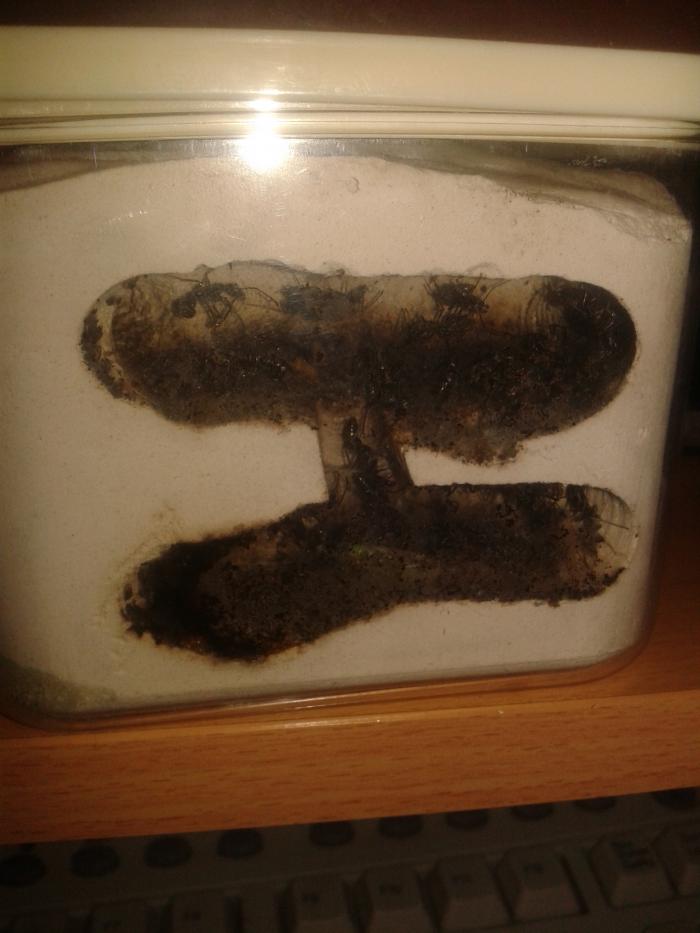 При перемещении старого формика - с помощью фонарика попытался посмотреть наличие расплода. Увидел только кучу мурашей, у одного - кокон, они будут забивать едой форм до тех пор пока позволяет площадь? Просто мессоры и лазиусы излишек не брали, а эти нычат все что можно есть в своих закрамах.