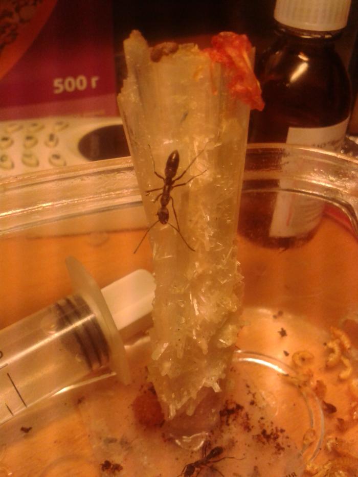 задмозг - я меняю им пространство арены. то камень положу (кальцит, как пемза, тока с большими дырками.. они там долго лазиют) то веток для паркура). Так вот последняя ветка по высоте выступает за края арены. И как то я заметил что на верхушке сидит мурах и палит меня. Он смотрел именно на меня. Я сдвинулся в сторону - он повернулся за мной, обратно - поворот в мою сторону. минут пять он наблюдал как япрячусь от негосижу и... БАЦ он ползет уже по столу!!! Я отвернулся от него на секунд 5-10 всего! Ветка не свешивается за края. От крайней точки до борта - см 5. Подумав что он нашел брешь в вазелине я вернул его на место и промазал края еще раз. Через минуты три он снова был на своём месте. И пока я смотрел вкось на него (попахивает дуркой уже?) он смотрел на меня. Когда мне надоело и я занялся делом он опять свалил! Поймав и вернув его на арену я проверил преграду - все четко. Наверное лаз - трубка для подачи воды в камеру увлажнения. Она вся смазана вазелином, но от её верхушки до края арены - 1-2 см, вполне преодолима для этих гигантов. Все мои действия мониторились Мурахом на ветке. Загнул трубку к формику и закрепил. Поворачивая голову к ветке я готов был торжествовать, но мураха уже не было на посту - он где? Правильно - на столе. Сканирует на съедобность моё яблоко... Это долгая история, и мурах победил в конце, даже когда я убрал ветку.Арена герметична в стыках, я заливал его водой когда чистил - протечек не было. Я проверил швы - все норм. КАК он выбирается я не в курсе.. Даже если они могут прыгать с веток и *парить* (читал что некоторые так делают), то когда я убирал ветку.. он прыгал через борт что ли?!