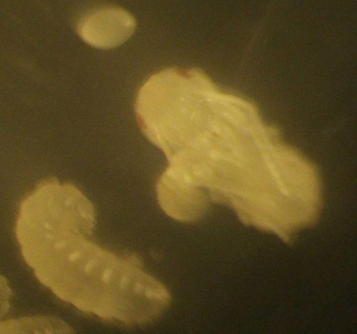 Пришли новые приключения. Вчера я заметил что личинки приняли очень странные очертания, я подумал что из-за стресса она их погрызла, но при рассмотрении под микроскопом, оказалось что это... куколки! Почему они без коконов?! Ведь у Lasius niger они должны расти в коконах, а эти открыты, это не нормально!(фото 4, 5, 6).