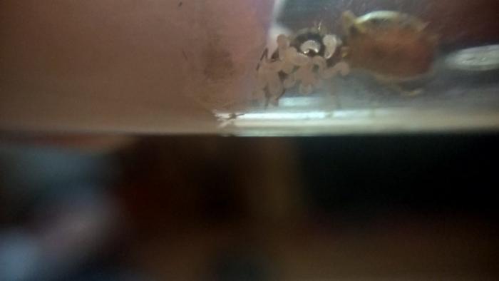 Та, на которую я возлагал самые большие надежды, которая как раз первая отложила яйца, съехала на второе место. Совсем нет никакого развития, лежат кучкой и всё. А вот у другой, в шприце, всё так хорошо, личинки даже стали уже больше. Может к ДР в середине месяца обрадует)