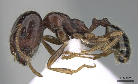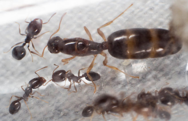 Снова кто-то из мономориумов. Наверное самый интересный из встреченных за эту поездку муравьев. Полностью черный с отблеском, похожи на дендролазиусов по окрасу. Нашел всего три семьи в регионе. Скрытны. Вылазят только вечером на закате. Днем их не найти, ночью только выманивать чем-то. Полиморфны. Есть как очень мелкие рабочие на 2 мм, так и более крупные и массивные на 4-4,5 мм, а также несколько промежуточных форм. Матки крупные, если сравнивать с другими мономориумами – 7-8мм. Оказалось, что больно жалят, однако не так агрессивны, как гемината. Если осторожно с ними работать, то можно и вообще не получить ужалов. Следы остаются на пару суток. Скорее всего полигинны, т.к. матки не летят, а выходят из муравейника, недалеко от входа спариваются с самцами из этой же семьи и возвращаются обратно в гнездо. Крылья ломают по ходу дела тоже где-то внутри муравейника, т.к. не видел, чтобы после спаривания матка задерживалась на поверхности. Лёт очень растянут. «Летели» всю неделю, что был на острове. Есть ли смысл в «отлетевших» матках, пока не знаю, яиц так и не отложили.
