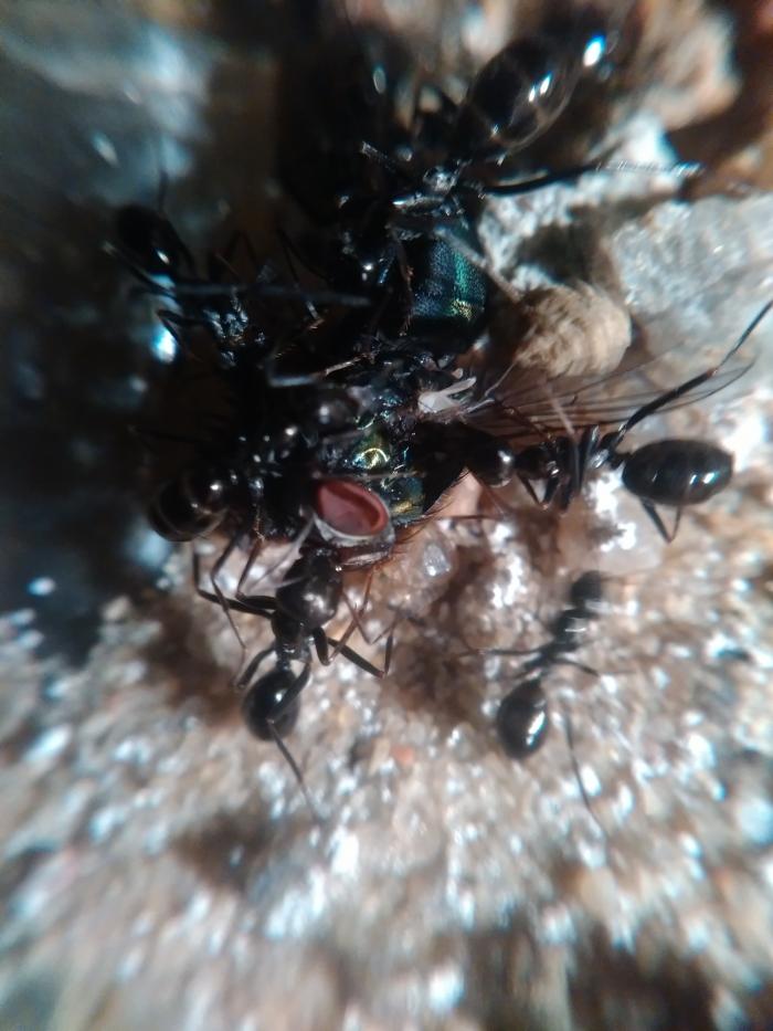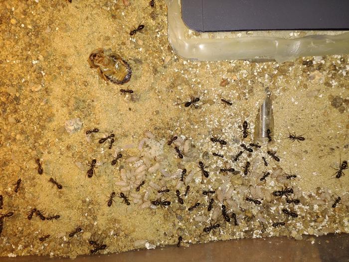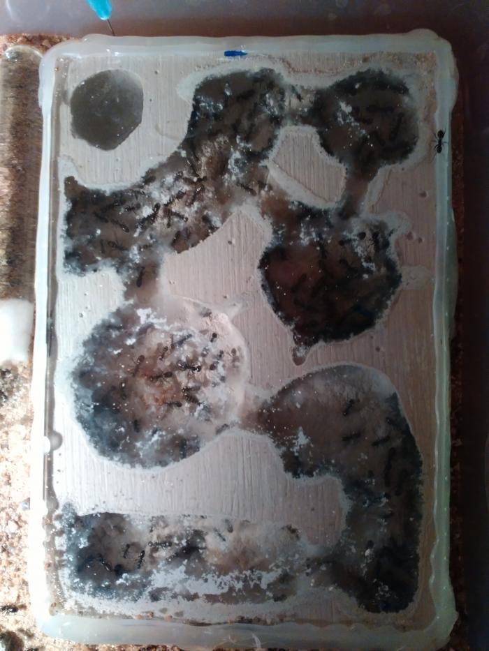 Продолжу. Кормил обильно, но делать это было трудно, талька на тот момент не было,блеск для губ им пофиг, аренка маленькая а население шустрое и агрессивное. В общем помучавшись месяц переселил в формик. А формик поместил в большую арену с песком и подогревом. Мурахи сразу стали активнее, свежие яйца итд итп. Но волна прошла, пришла осень, и я решил, а пусть отдохнуть. Отключил обогрев и ровно на 2 месяца на лоджию)) спать не спали,одиночки так и бродили по арене,было пару тропиков,причём из моего поколения,крупных. Но все в пределах так сказать. И вот зима закончилась))) есть яйца,есть очень крупные личинки,есть уже и куколки. Активно едят мясо тараканов, невинно мною убиенных)) Сейчас живут пока ещё в своём первом формике, но больший уже готов и ждёт. Фото как это выглядит сейчас прилагаются.