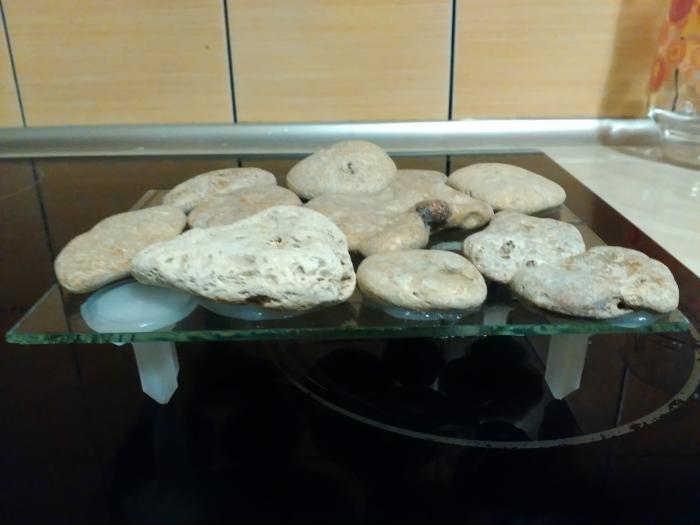 Заняло 15 минут, камни на стекло 15х20, обрезаные поршни от шприцев как ножки, все на силикон. Быстро и надёжно. П.с. в середке между камешками в стекле дюрочка специально чтоб там и рыли.