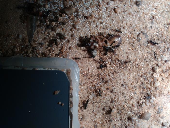Коконы носят по верьху,а утром как свет включу, пока камни не прогреты так вообще складывают на поверхности. Когда я их покупал,меня предупредили что нужно греть, направленная лампа накаливания 40вт, под лампой песок прогреты до 60, мурахами нравится, роют как собачки,бегают, и ещё, трупики и остатки тараканов перед тем как нести на свалку по пол дня сушат на самом горячем месте.