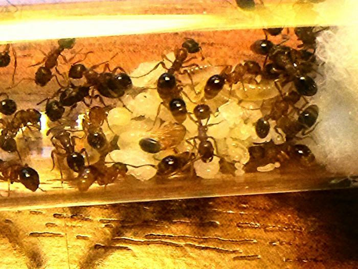 Мирмики уже неделю живут в формикарии . Муравьёв пятьдесят с небольшим и много расплода виде куколок и личинок .