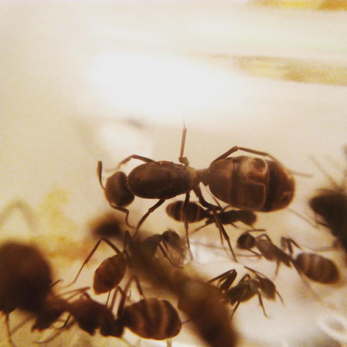 Париусы (сегодня при подсчёте их я насчитал уже 16 штук), как правило, сидят в пробирке и что-то обсуждают. На проверку арены периодически выбегает один мураш, наворачивает пару кругов и идёт домой. Если потревожить этих ребят - на арену выбегает 3-5 мурашей и очень внимательно её изучают.