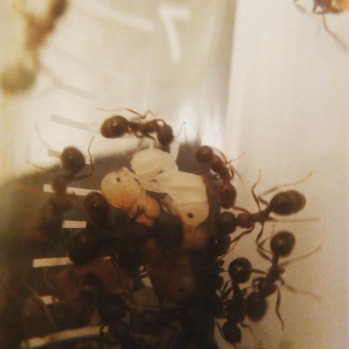 К настоящему моменту все коконы (кроме одного, микроскопического) вскрыты, все живы, но из расплода - только пара пакетов яиц, часть мурашей сидит в "солярии", часть - над яйцами, в верхней пробирке. Все дружно притворяются шлангами, и снова, за отсутствием личинок, я не нахожу этот факт чем-то странным.