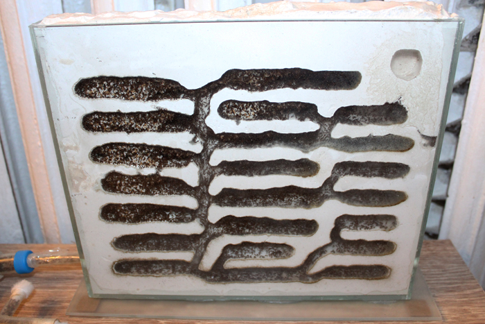 Не буду углубляться в подробности. Дальше всё пошло по классике, которую вы читали у Вити KVA: колония растет, неистово ест, строит стенки из расплода, закапывается в него. В итоге места для рабочих почти не было – большую часть маленького гипсового формикария занял расплод. Но решение переселять пришло, когда в семье стали появляться аномально огромные рогатые личинки. И с первой куколкой крылатой особи было решено – переселять! Иначе кто их знает, может из-за недостатка места они их буду поедать…