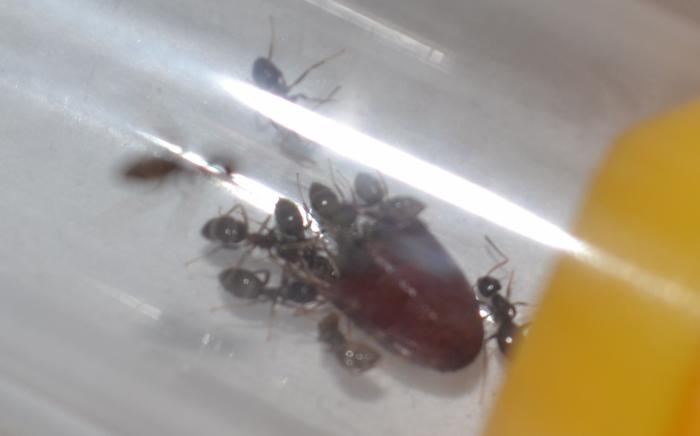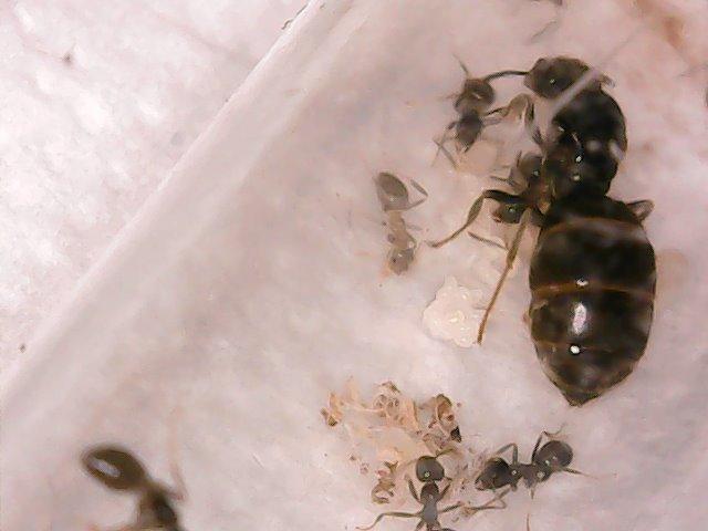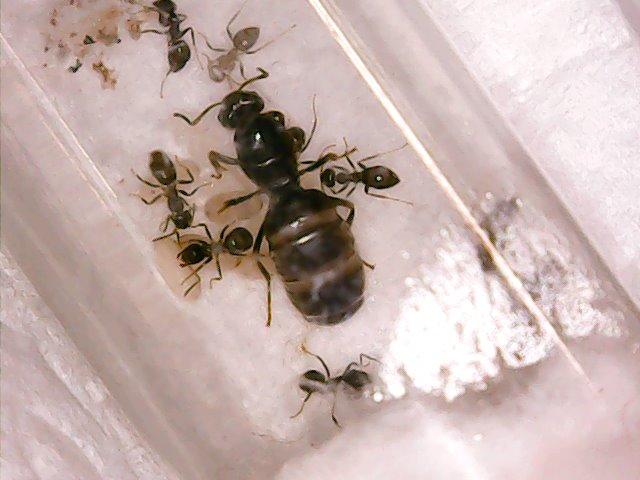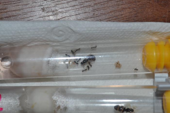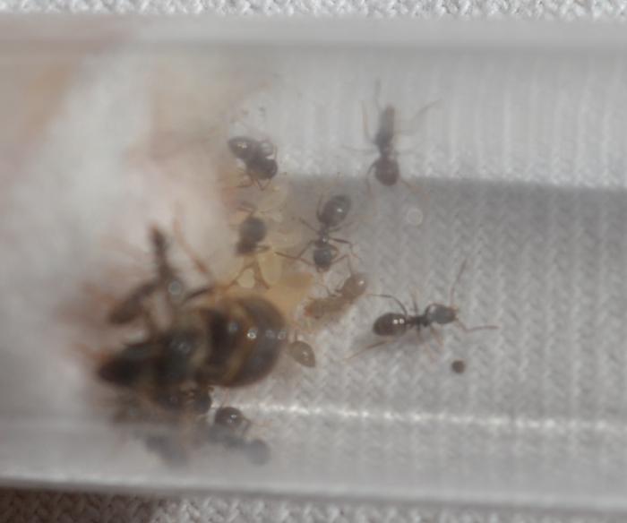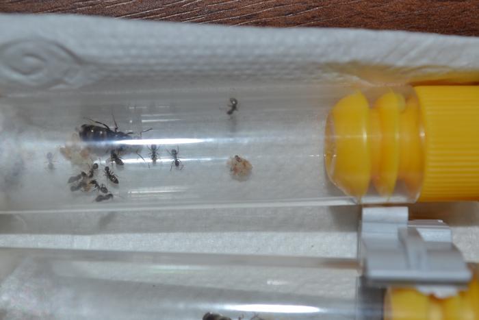Поймал примерно месяц назад несколько самок лазиусов. Через несколько дней они отложили кучки яиц. Пару раз давал им сахарный сироп (не совсем понимаю что значит 1:1 в некоторых постах, я разводил 2 чайных ложки на пол стакана воды). 10 августа у первой самки из коконов появились маленькие муравьишки. У второй большой пакет яиц. Пару раз давал им сахарный сироп(а ну да, уже писал это), а сегодня решил дать медовый. Но пили они его как-то неохотно, а потом каплю медового сиропа, оставленную в пробирке, вообще закидали мусором.